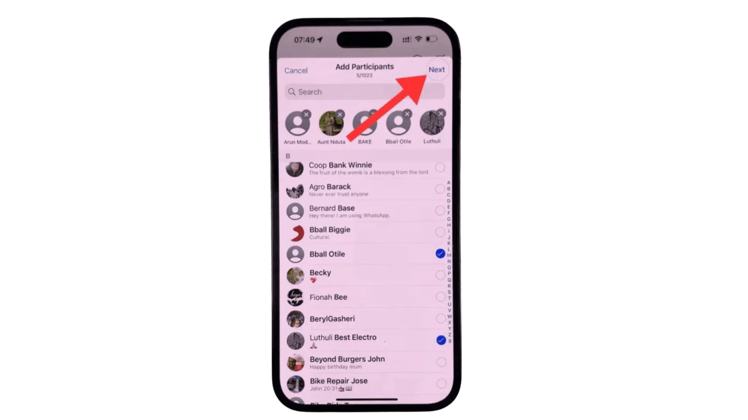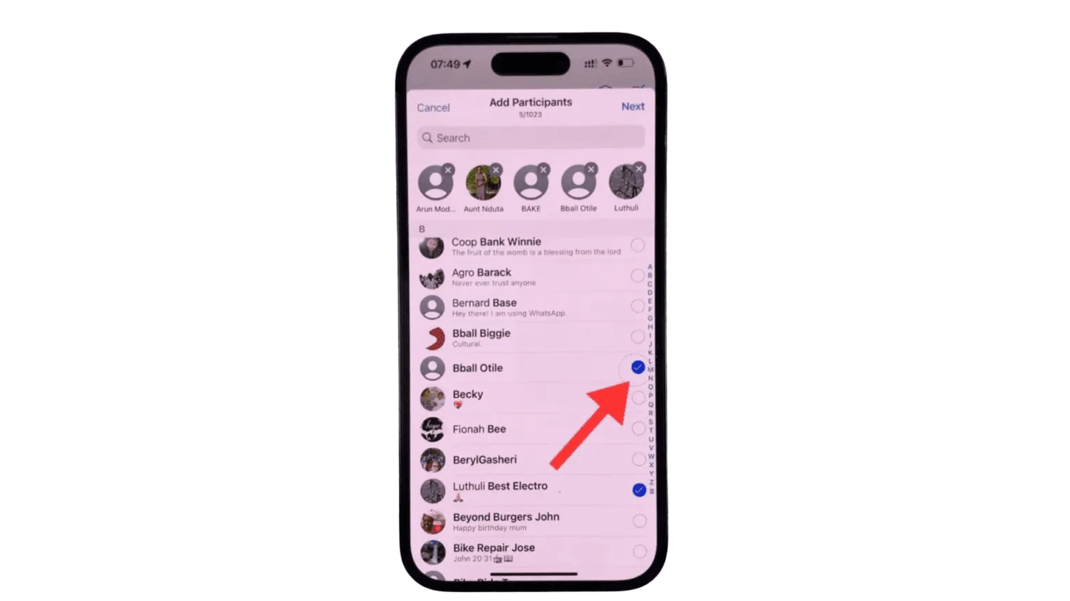 Step 5: Simply tap on the contact to add them to the group; a blue checkmark will appear next to their name, indicating they’ve been selected. Alternatively, you can use the search bar to quickly find and add specific contacts to your group.