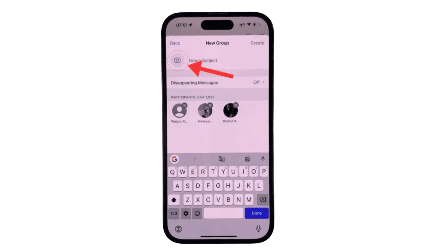 Step 7: On this page, you’ll find a camera logo in the top left corner where you can upload a profile picture for your group. Additionally, there’s a text bar at the top of the screen where you can enter the name of your group.