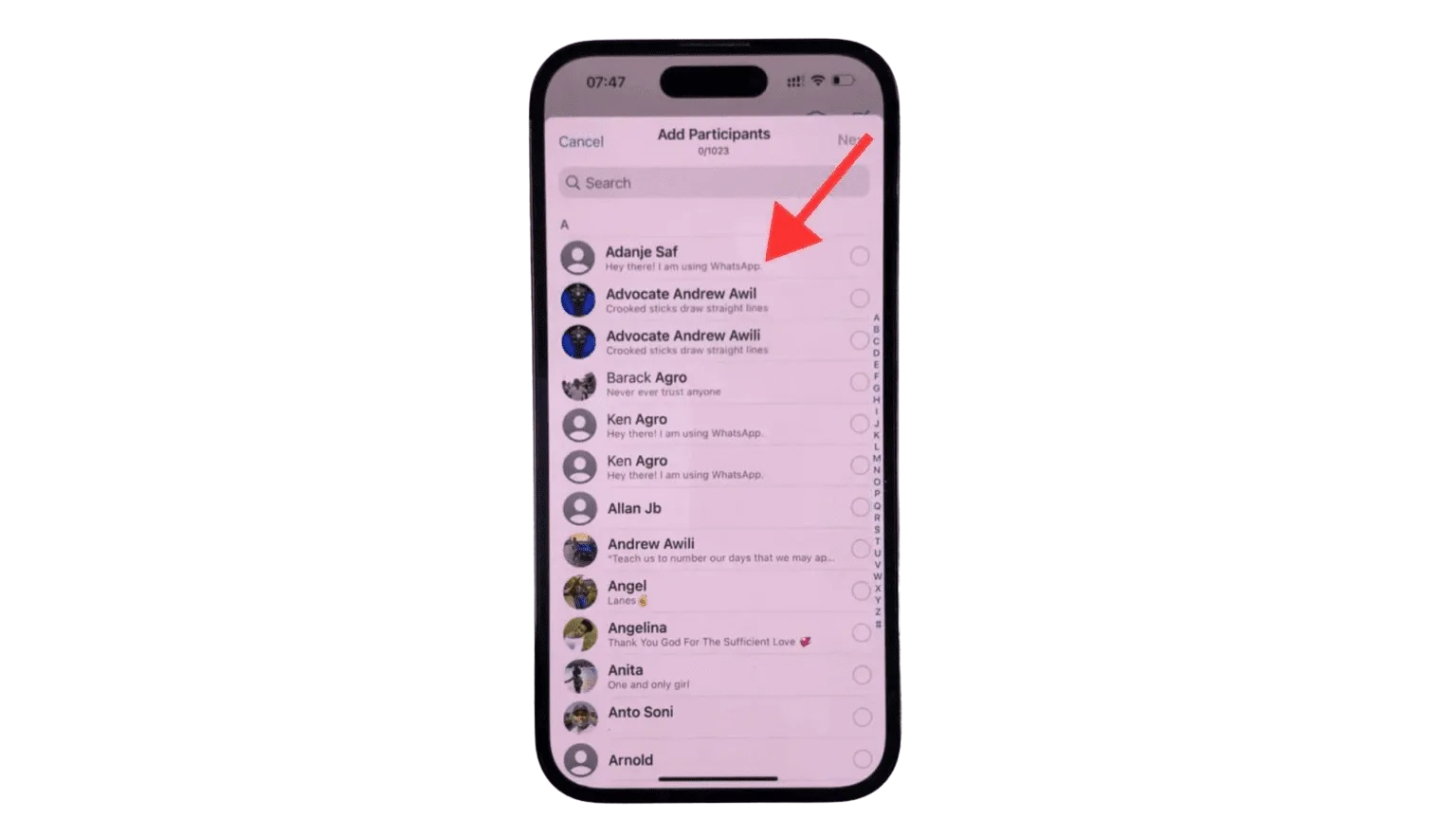 Step 4: You will be presented with a contact list. Choose at least two contacts and up to a maximum of 1023 from this list to add to your WhatsApp group.